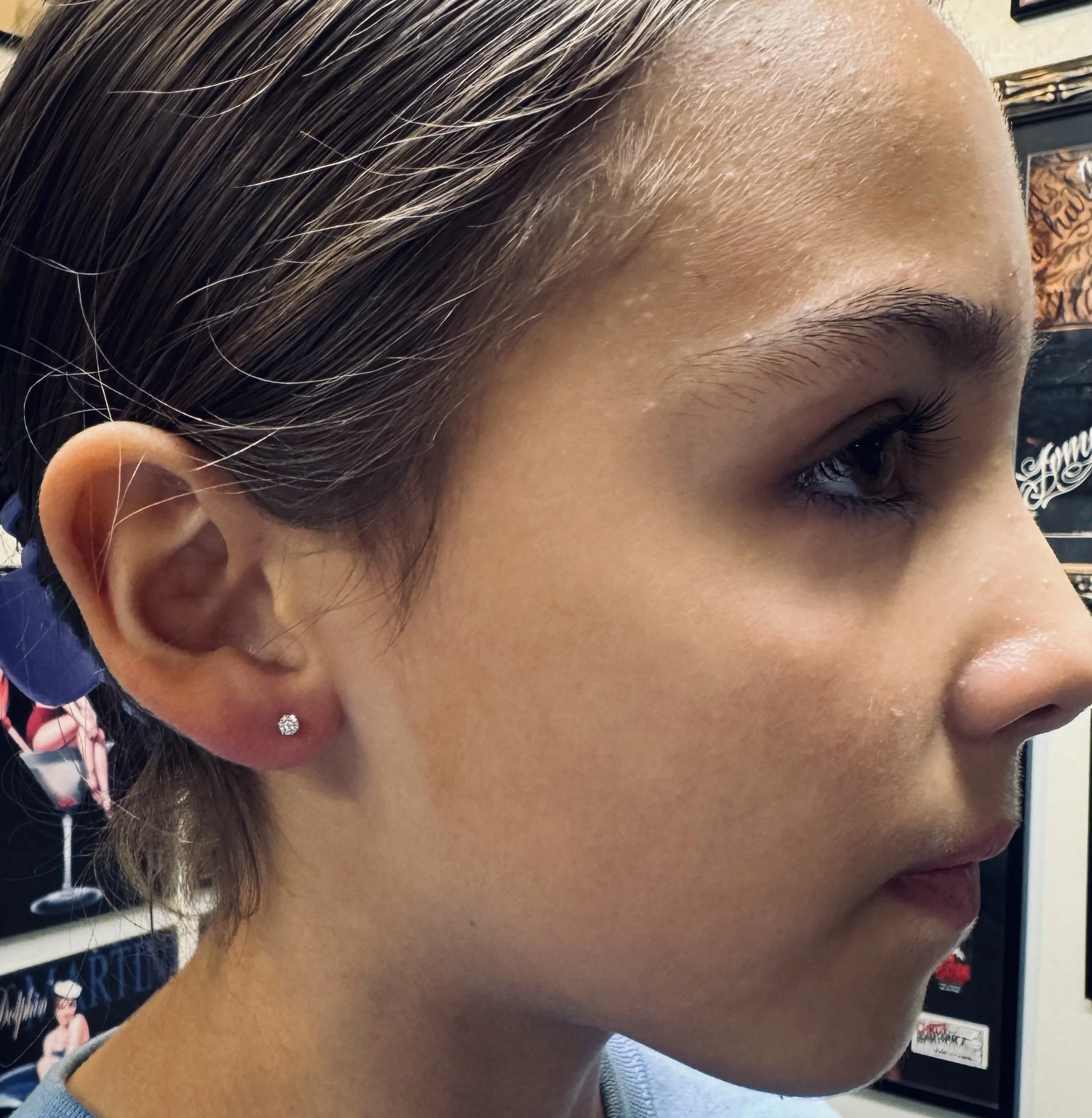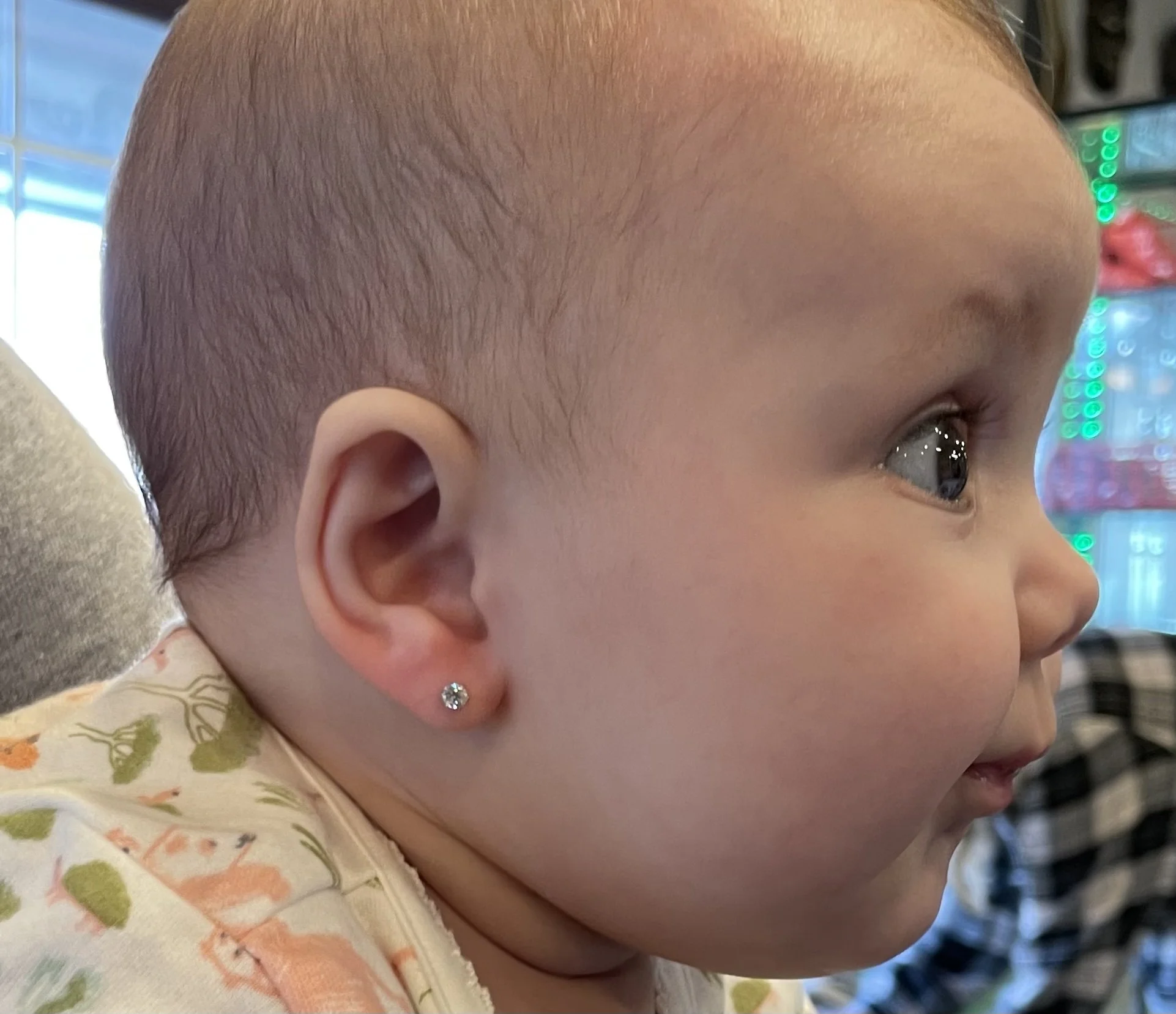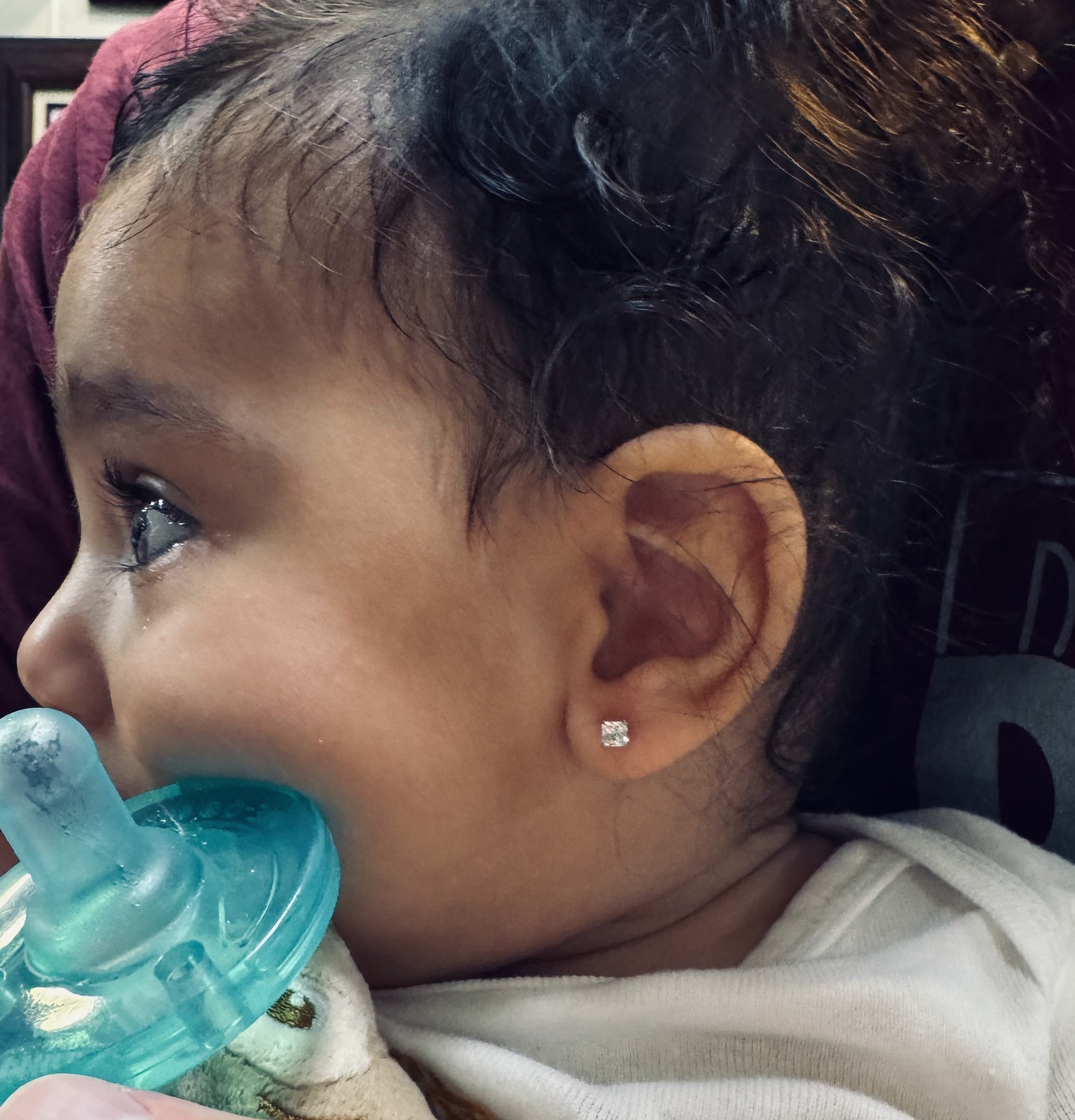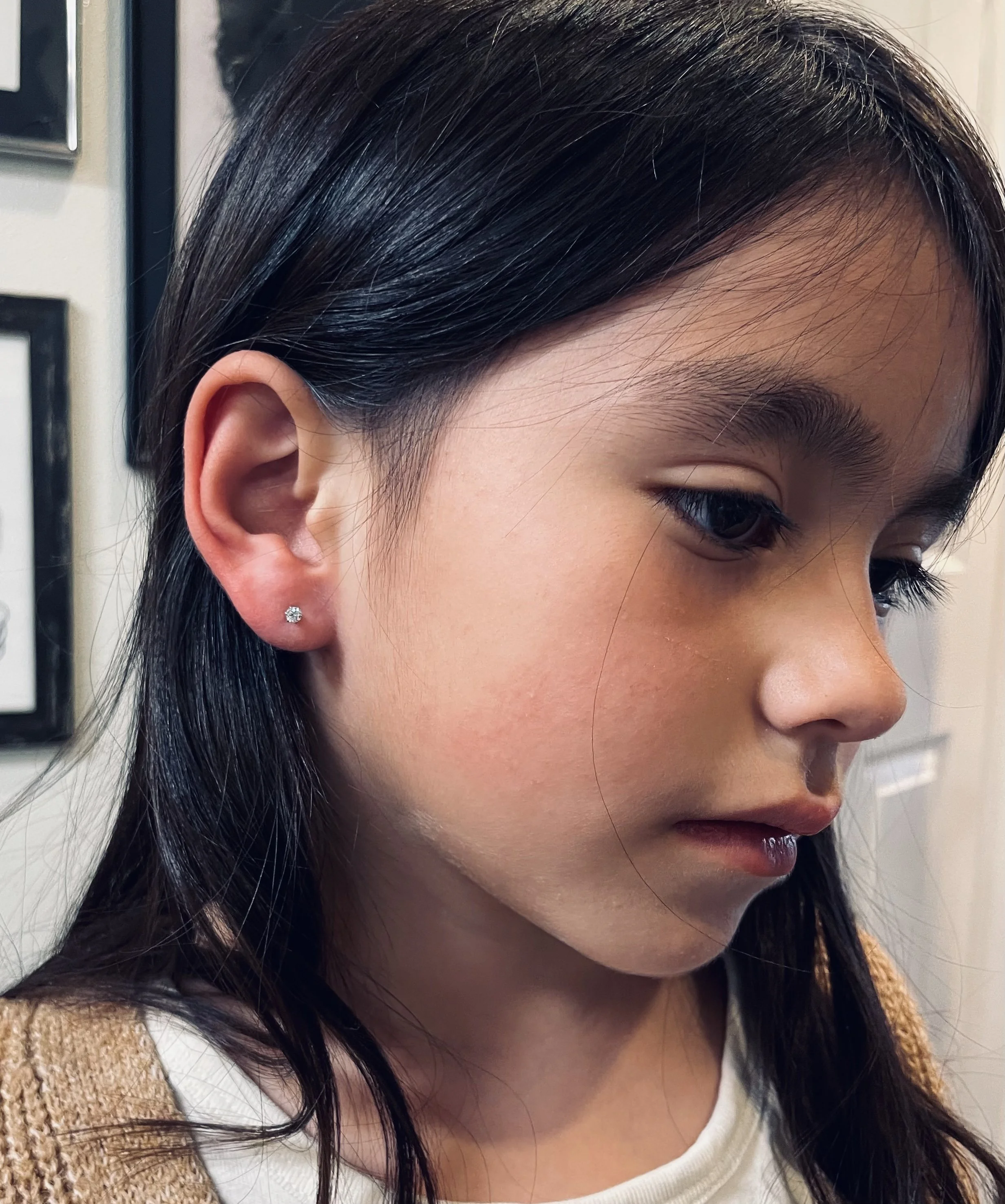 Infant/Child ear Piercing w/Japanese Titanium flat Back Studs with 3mm princess cut stones.