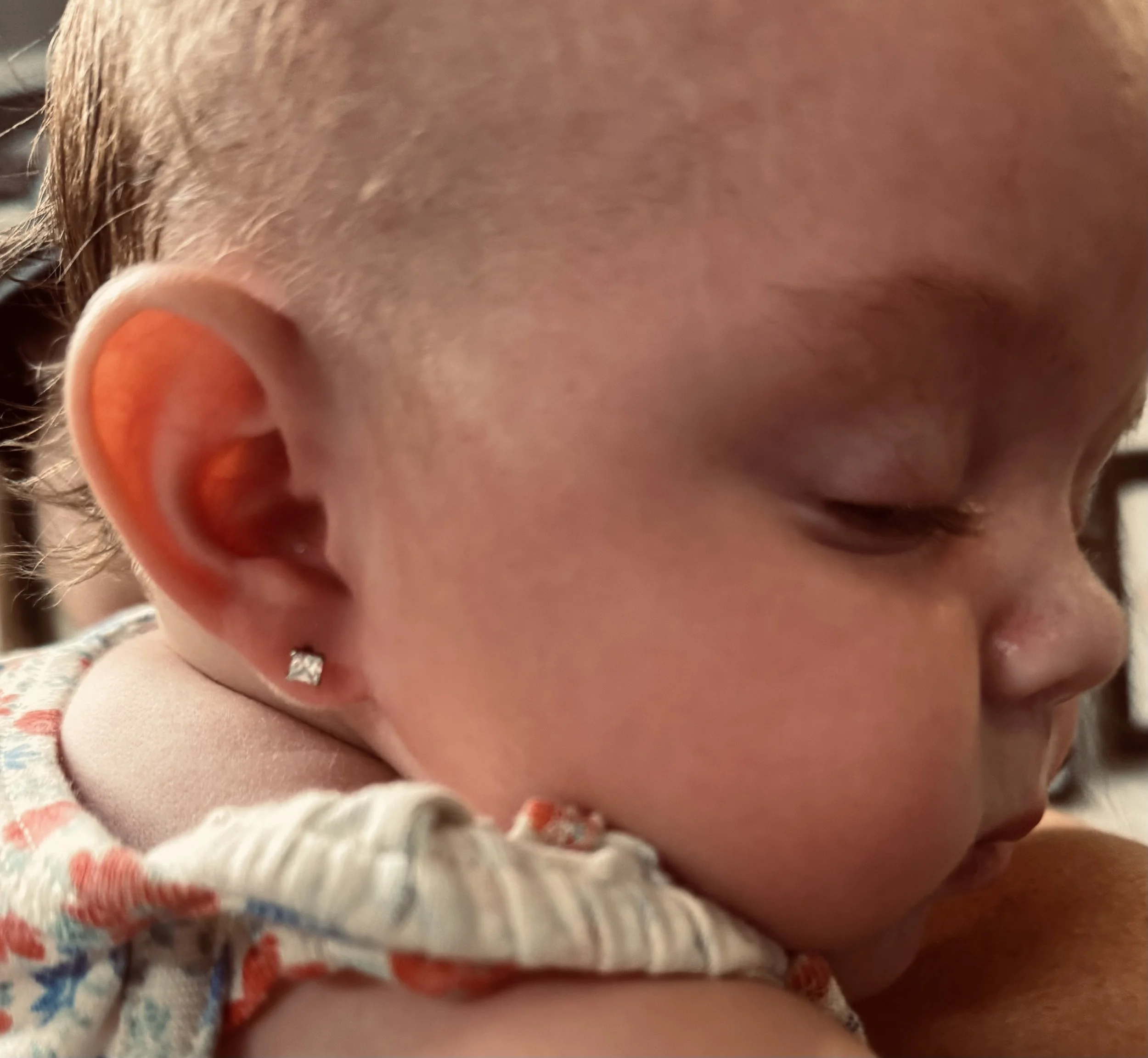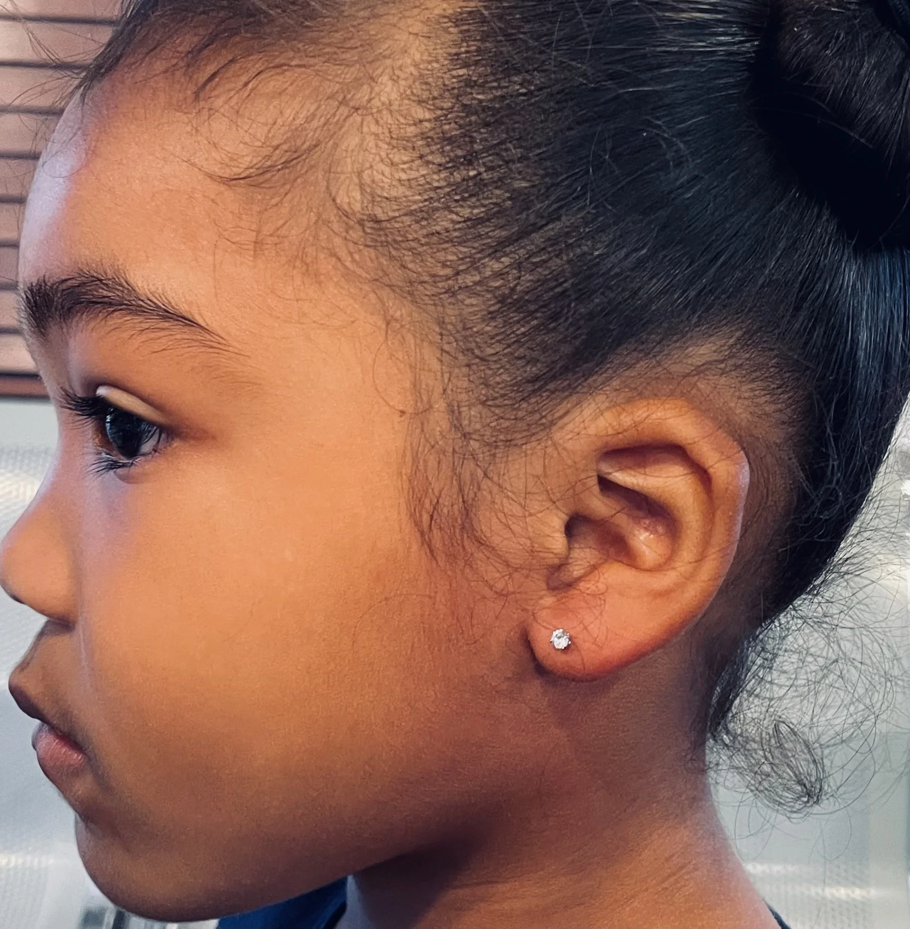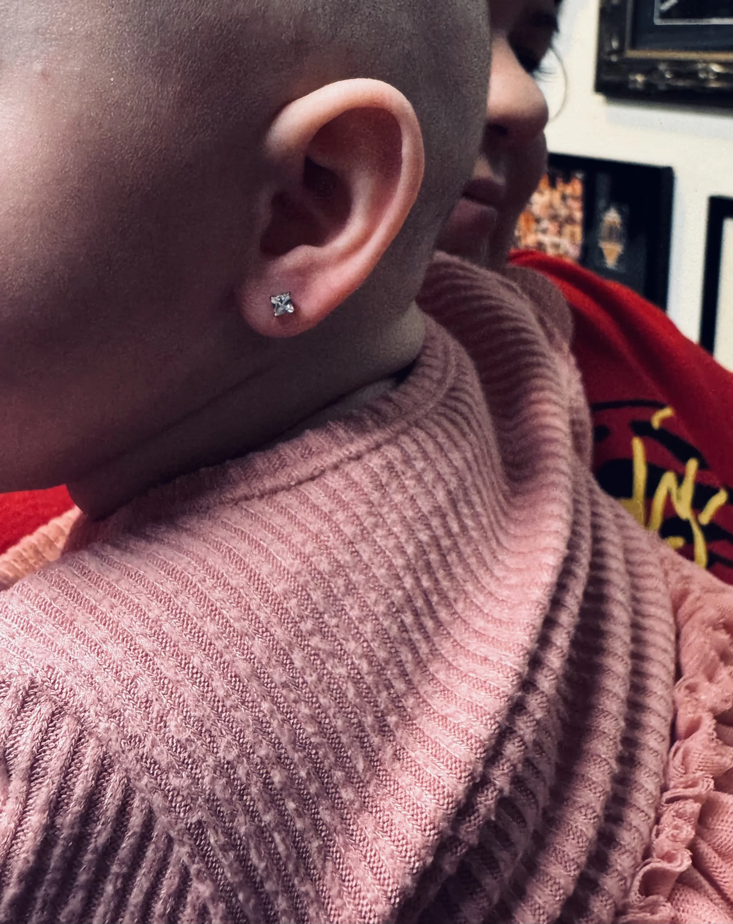 Infant/Child ear Piercing w/Japanese Titanium flat Back Studs with 3mm princess cut stones.