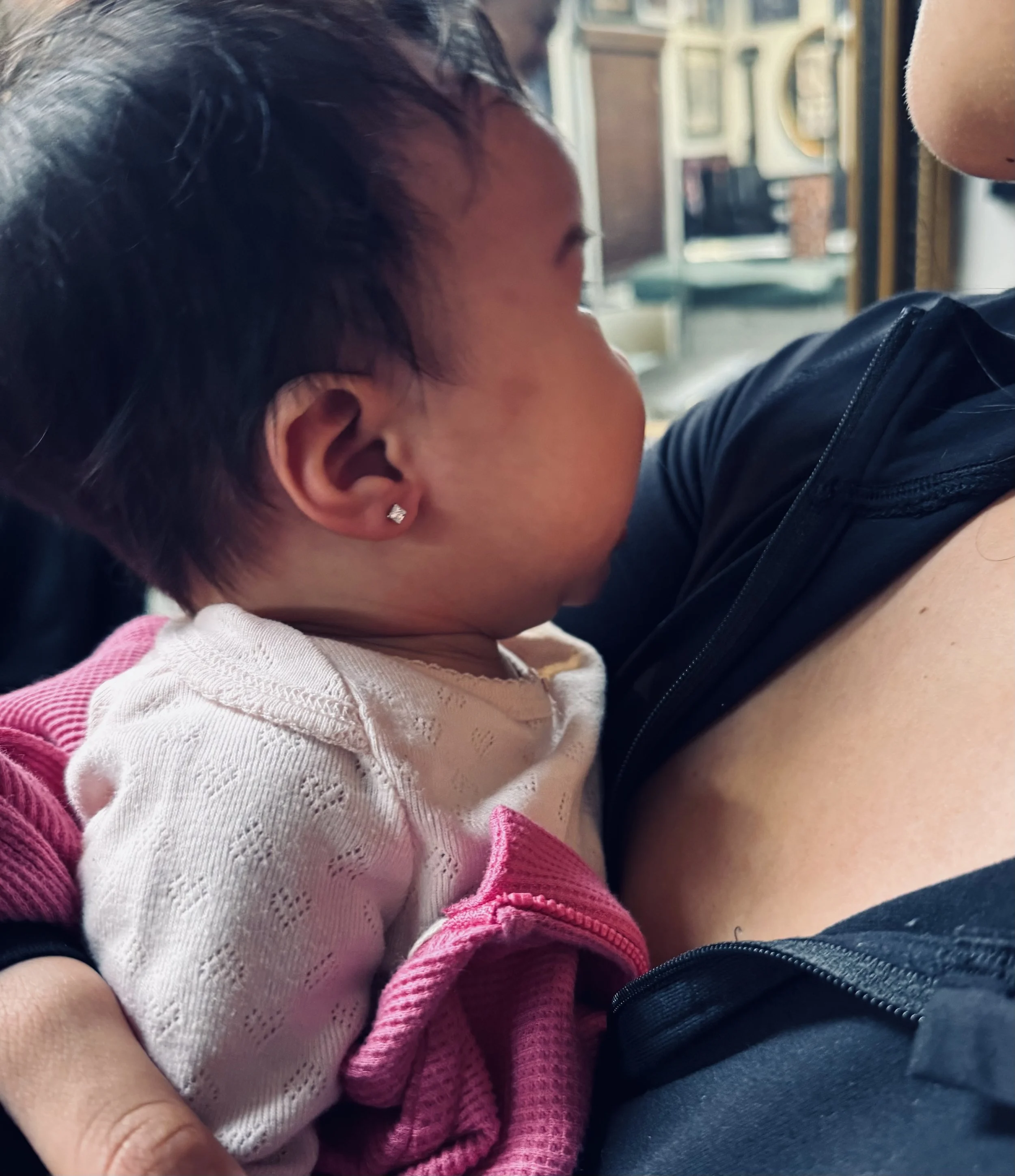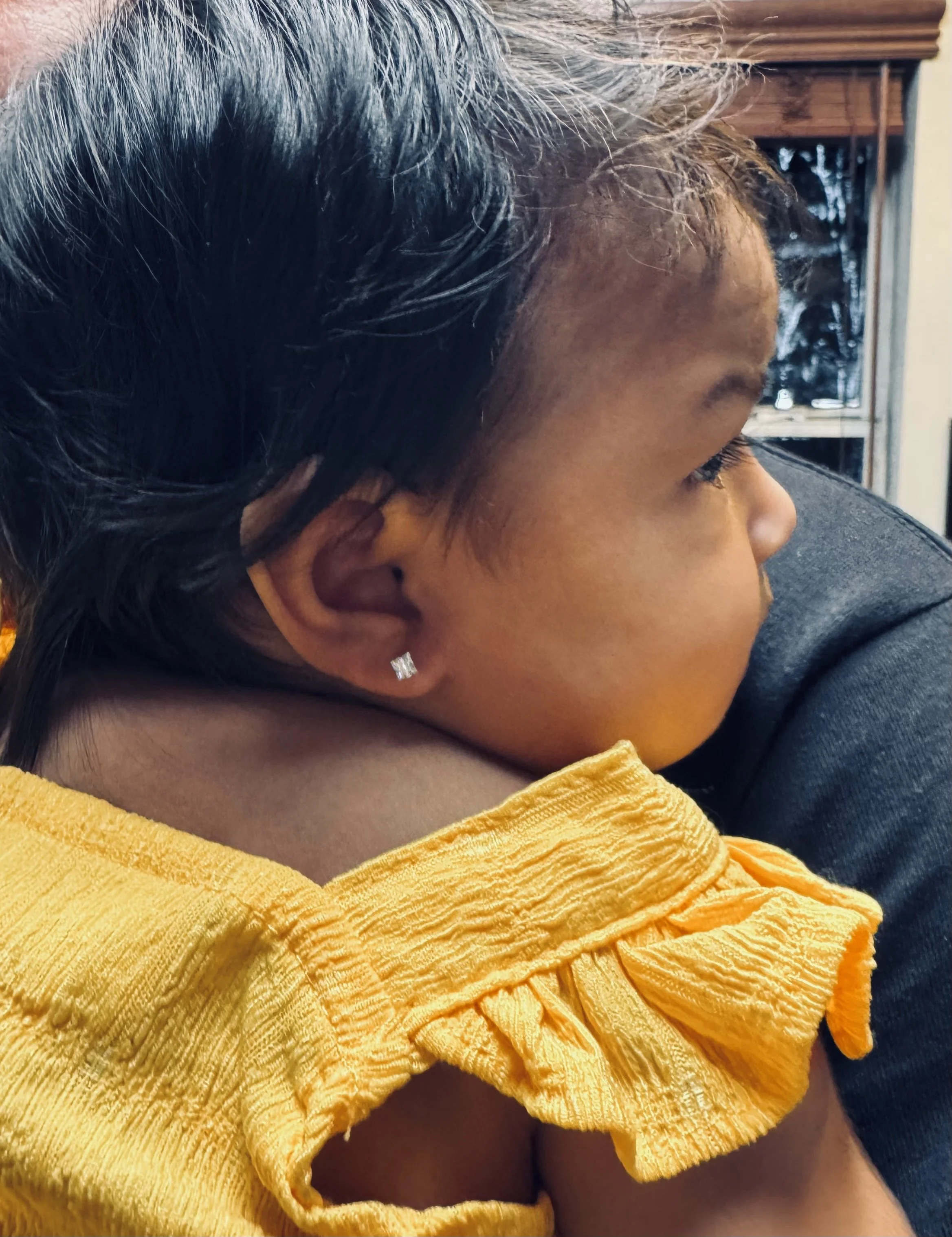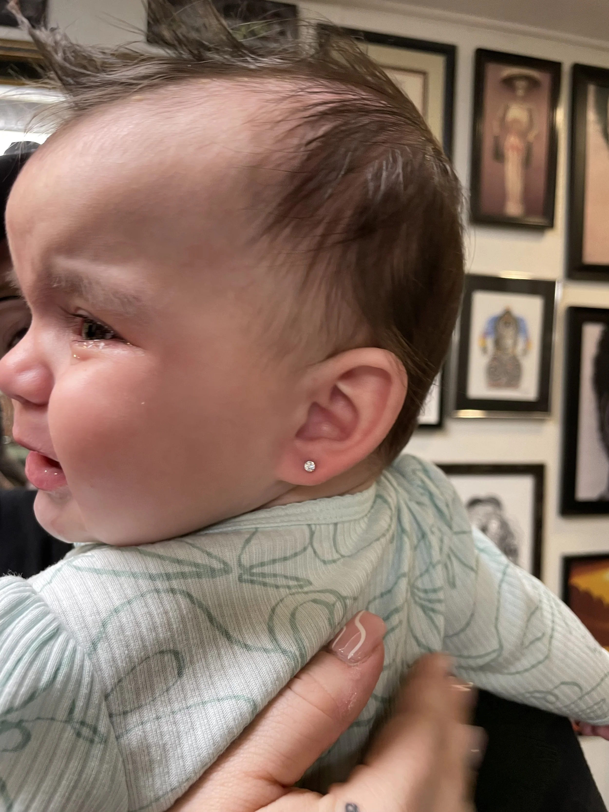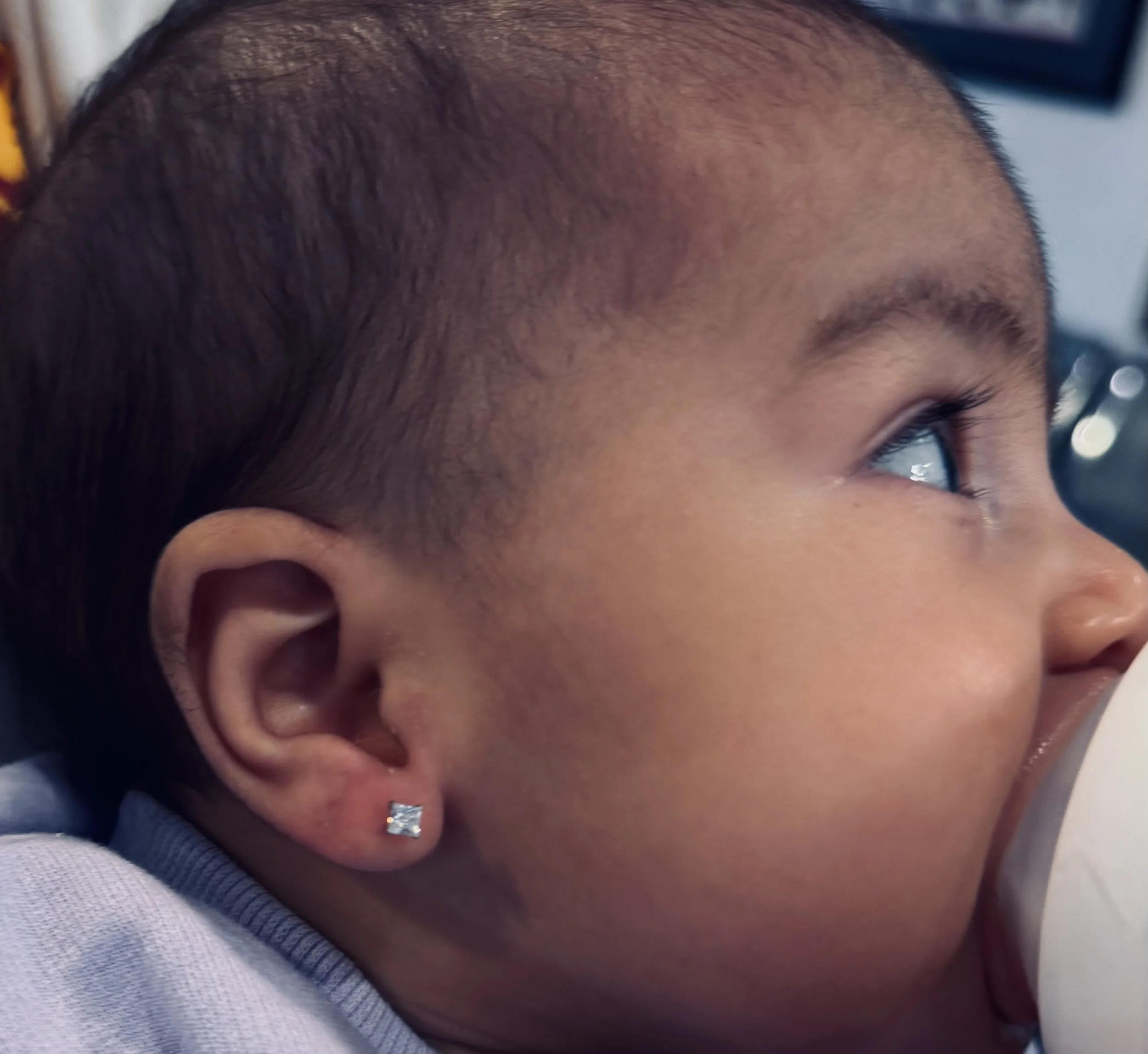 Infant/Child ear Piercing w/Japanese Titanium flat Back Studs with 3mm princess cut stones.